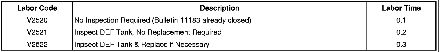 This bulletin provides a service procedure to inspect and replace (if necessary) the Diesel Exhaust Fluid (DEF) tank on certain 2011 model year Chevrolet Silverado and GMC Sierra 2500/3500 Series vehicles equipped with a 6.6L Turbo Diesel Engine (LML/LGH) and registered in Alberta, British Columbia, Labrador, Manitoba, Ontario, Quebec, and Saskatchewan. Some DEF tanks may have been built with a low internal resistance that could cause the tank to set DTC codes P21AB, P203D or P21BO under certain operating conditions. This service update should be only performed along with recall bulletin 11183 to avoid a second customer visit.