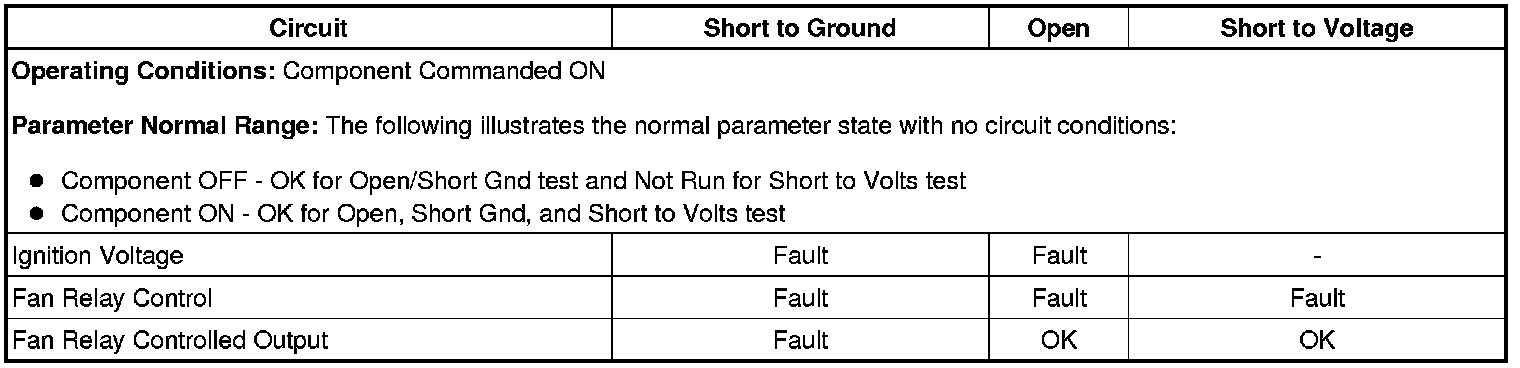 1. Engine operating, command the cooling fan clutch ON to 80 % and then OFF to 0 % with a scan tool. Observe the scan tool Test Status parameters listed below: