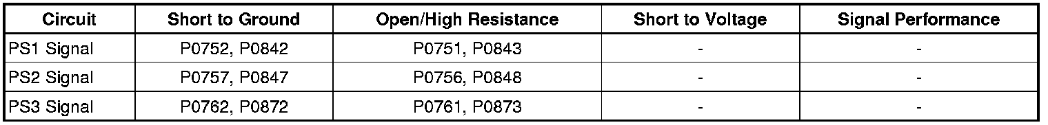 * When DTCs P0751 and P0843 are set in combination, this may indicate an open circuit condition on the pressure switch 1 circuit or the shift valve 1 is stuck in the destroked position.