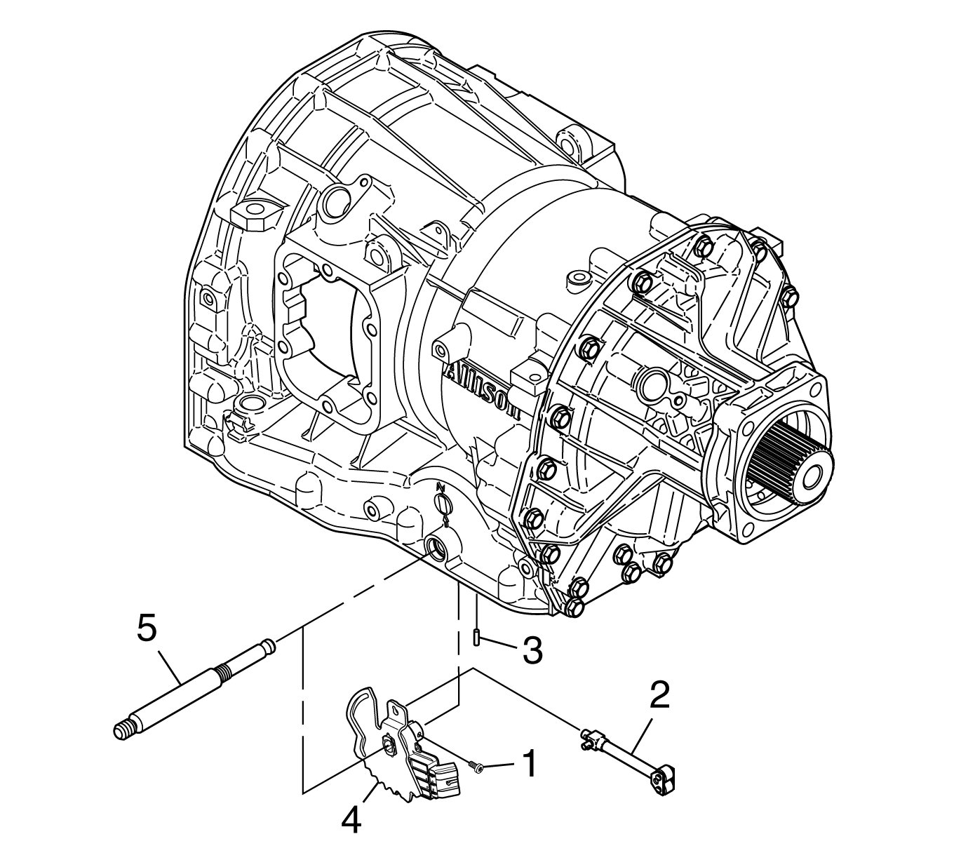1. Place the new detent lever/IMS assembly (4) in position in the transmission case. Rotate the detent lever/IMS assembly to engage the park pawl apply assembly (2). Reinstall the manual shift shaft (5) through the manual shift shaft seal and through the detent lever/IMS assembly (4).