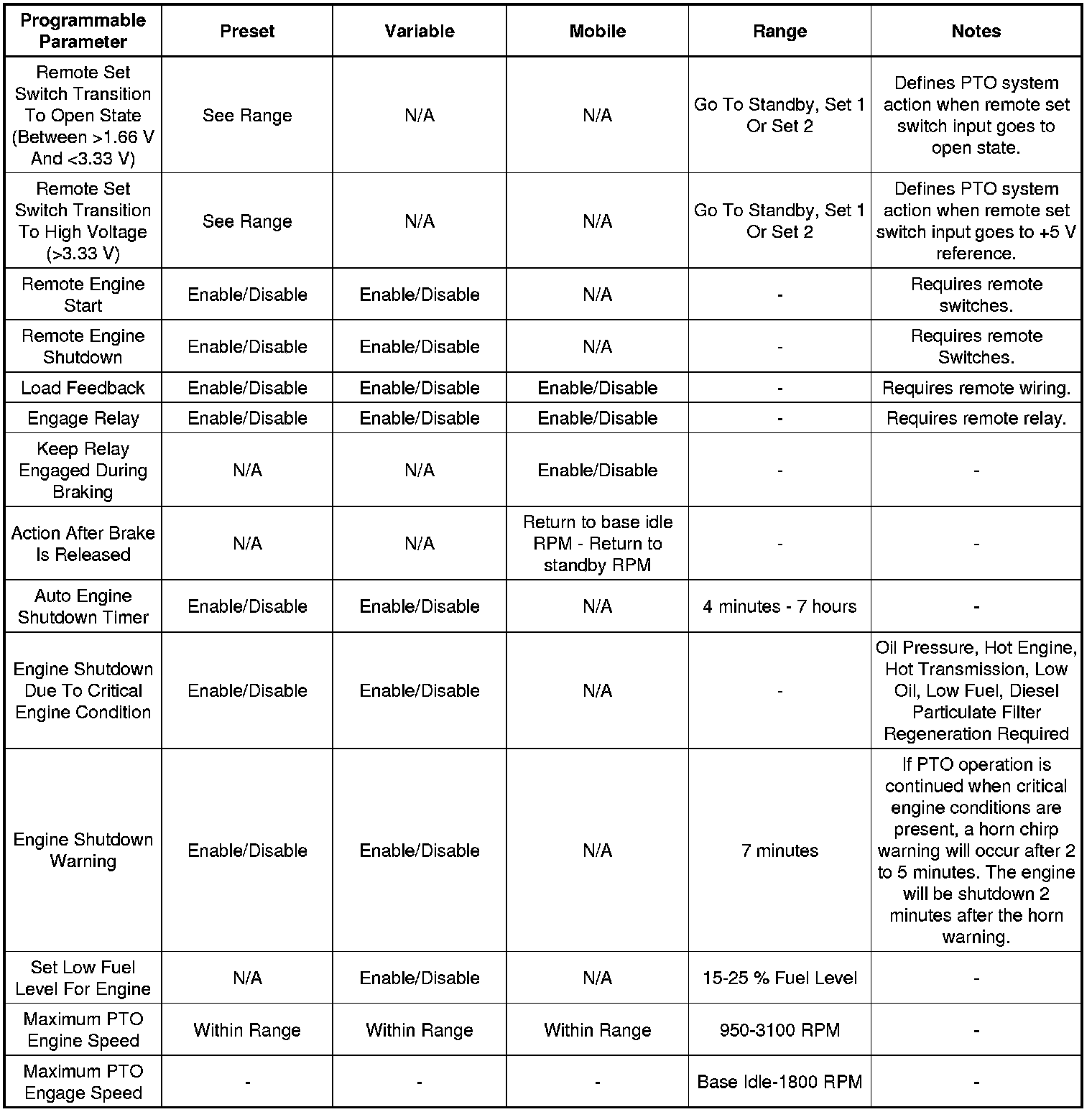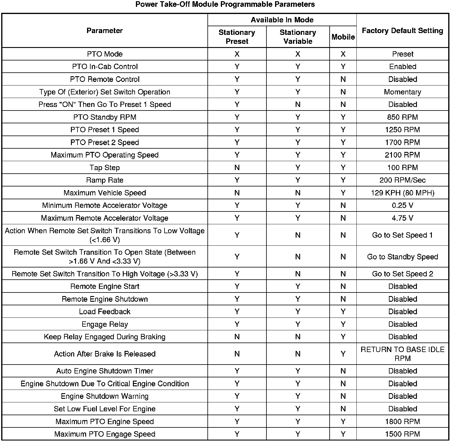 The power take-off module requires that several parameters be setup according to customer requirements. Refer to the table below for available parameters and recommended setting. Refer to the GM Upfitter Integration website, , for bulletins #79 and #80, which have extensive descriptive information about the power take-off system.