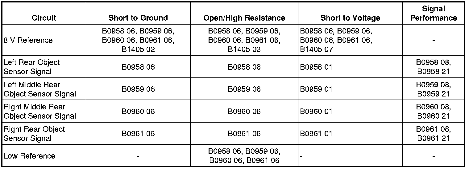 The object sensors are 3-wire sensors that are used to determine the distance between the vehicle and an object of interest. The parking assist control module supplies 8 V to the object sensors via the 8 V reference circuit and provides ground via the low reference circuit. The parking assist control module triggers the sensors in a sequential loop. After each sensor transmits, the parking assist control module uses the sensor echo received through the signal circuit to calculate the distance and position of an object.