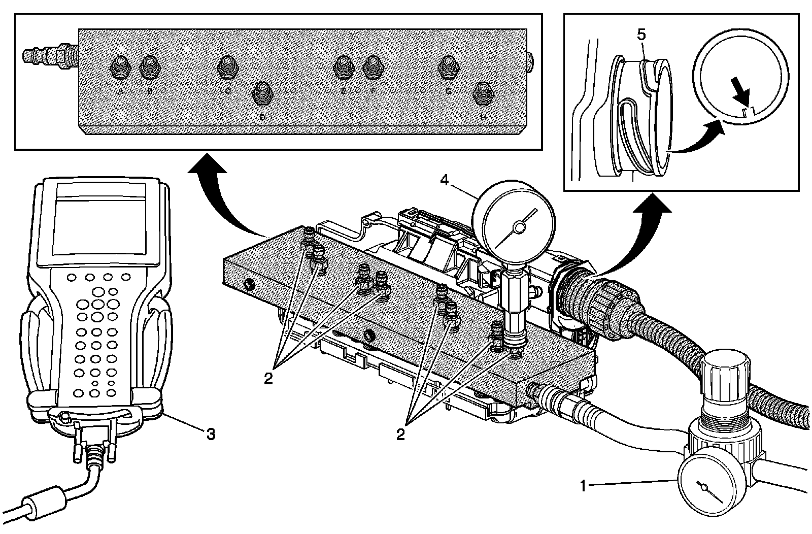Note: With the ignition ON and the engine OFF, the transmission control module (TCM) will normally cycle some of the transmission solenoids On and Off to facilitate keeping the ports and solenoids clean and free of debris. This dither function is a normal activity and will cause the valves to cycle open and closed quickly when the TCM is powered up. This may cause some air to exit the ports where the PSI gauge is not connected as those solenoids cycle on and off.