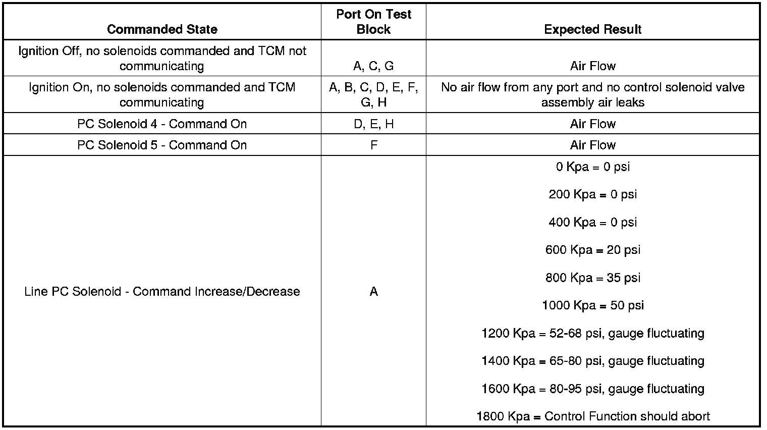 The purpose of this procedure is to test the functionality of the control solenoid valve assembly solenoids for a gross stuck open or stuck closed condition, or a faulty transmission fluid pressure switch. DT 47825-1 is bolted to the control solenoid valve assembly on the valve body mounting surface. Pressurized air is passed into the aluminum test block, through the control solenoid valve assembly solenoid passage and back to the outlet port on the test block. A scan tool is used to command the solenoids ON and OFF. While observing the airflow, one can determine the valve functionality. The recommended shop air pressure for this test is regulated to 90-100 psi.