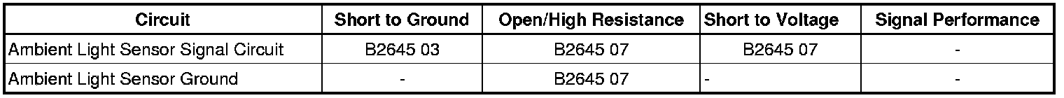 The DTC will set when the BCM detects the ambient light sensor signal voltage is above 4.9 V.