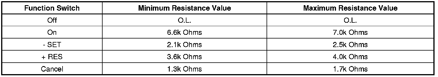2. Cruise control switch ON, measure the resistance between terminal 1 and terminal 3 while individually activating and holding each cruise control function switch and compare the resistance reading to the values in the table below.