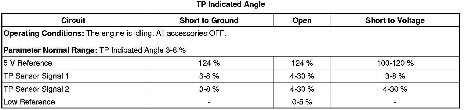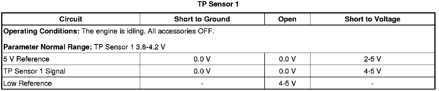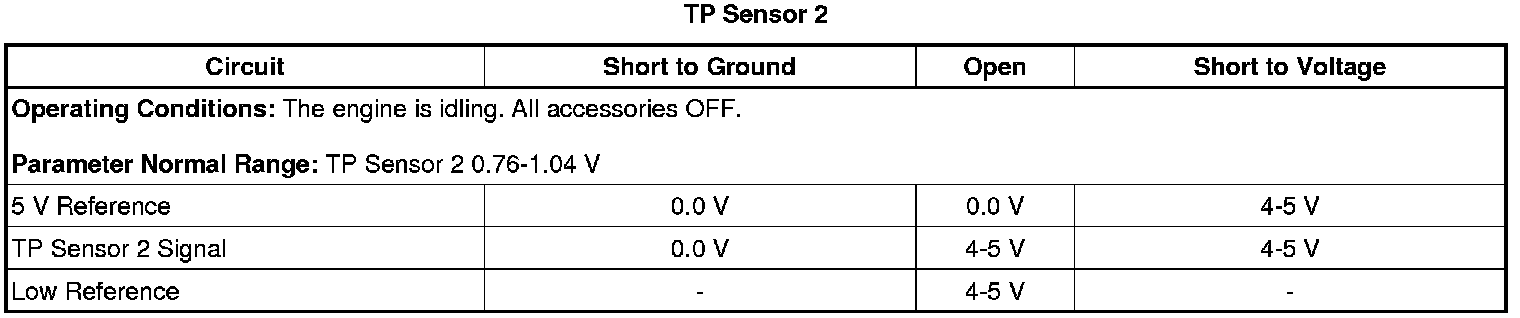 The throttle body assembly contains 2 throttle position sensors. The TP sensors are mounted to the throttle body assembly and are not serviceable. The TP sensors provide a signal voltage that changes relative to throttle blade angle. The engine control module (ECM) supplies the TP sensors with a common 5 V reference circuit , a common low reference circuit, and two independent signal circuits. The TP sensors have opposite functionality. TP sensor 1 signal voltage decreases from greater than 4 V at idle to less than 1 V at wide open throttle (WOT). TP sensor 2 signal voltage increases from less than 1 V at idle to greater than 4 V at WOT.