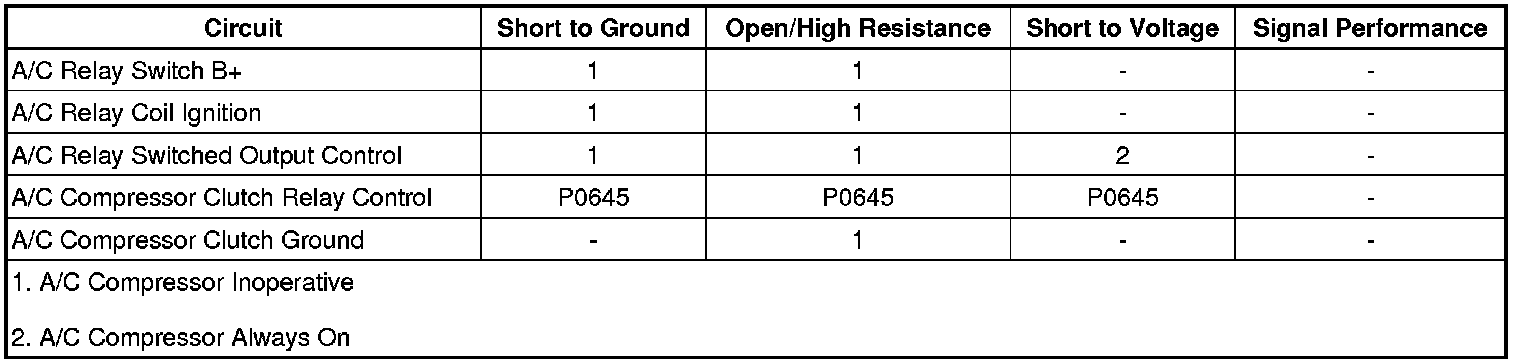 The ECM detects an open on the control circuit of the A/C compressor clutch relay when commanded OFF with the engine in crank or run status.