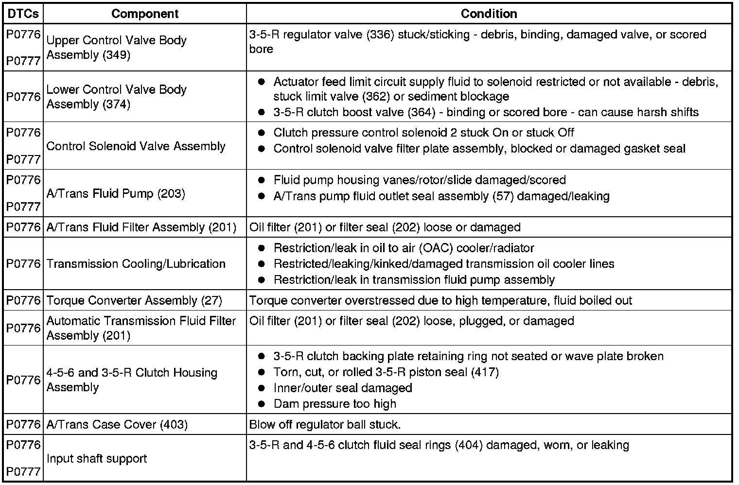 4. Listed in the table below, are conditions for each component that could set DTC P0776 or P0777. Carefully inspect each component for that condition. Repair or replace as necessary.