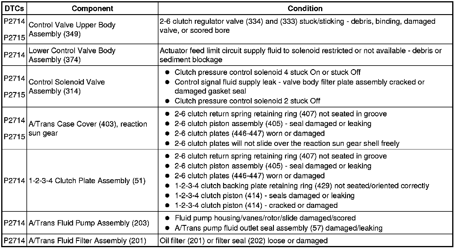 4. Listed in the table below, are conditions for each component that could set DTC P2714 or P2715. Carefully inspect each component for that condition. Repair or replace as necessary.