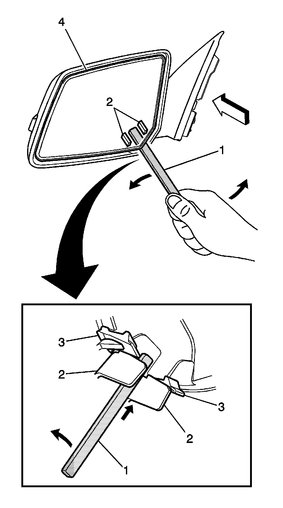 1. Retain pressure on the top outer corner of the mirror glass (4).