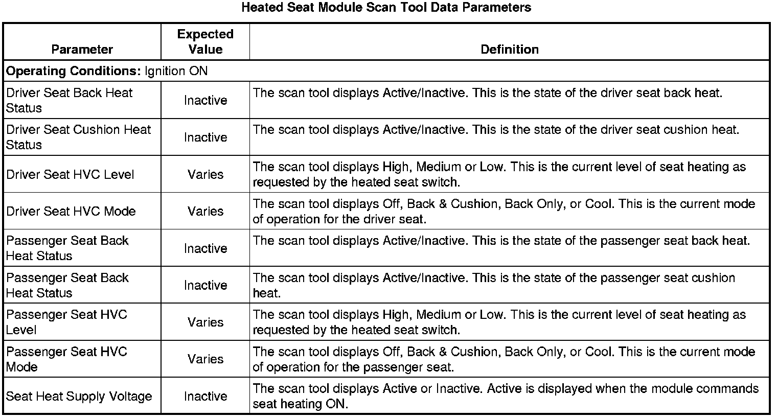 Driver Seat and Passenger Seat Heater Control Module Scan Tool Information