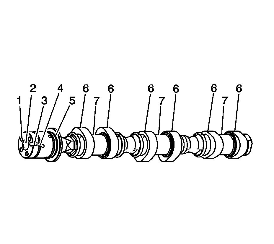 6. Inspect the camshaft lobes (6) and journals (7) for the following conditions: