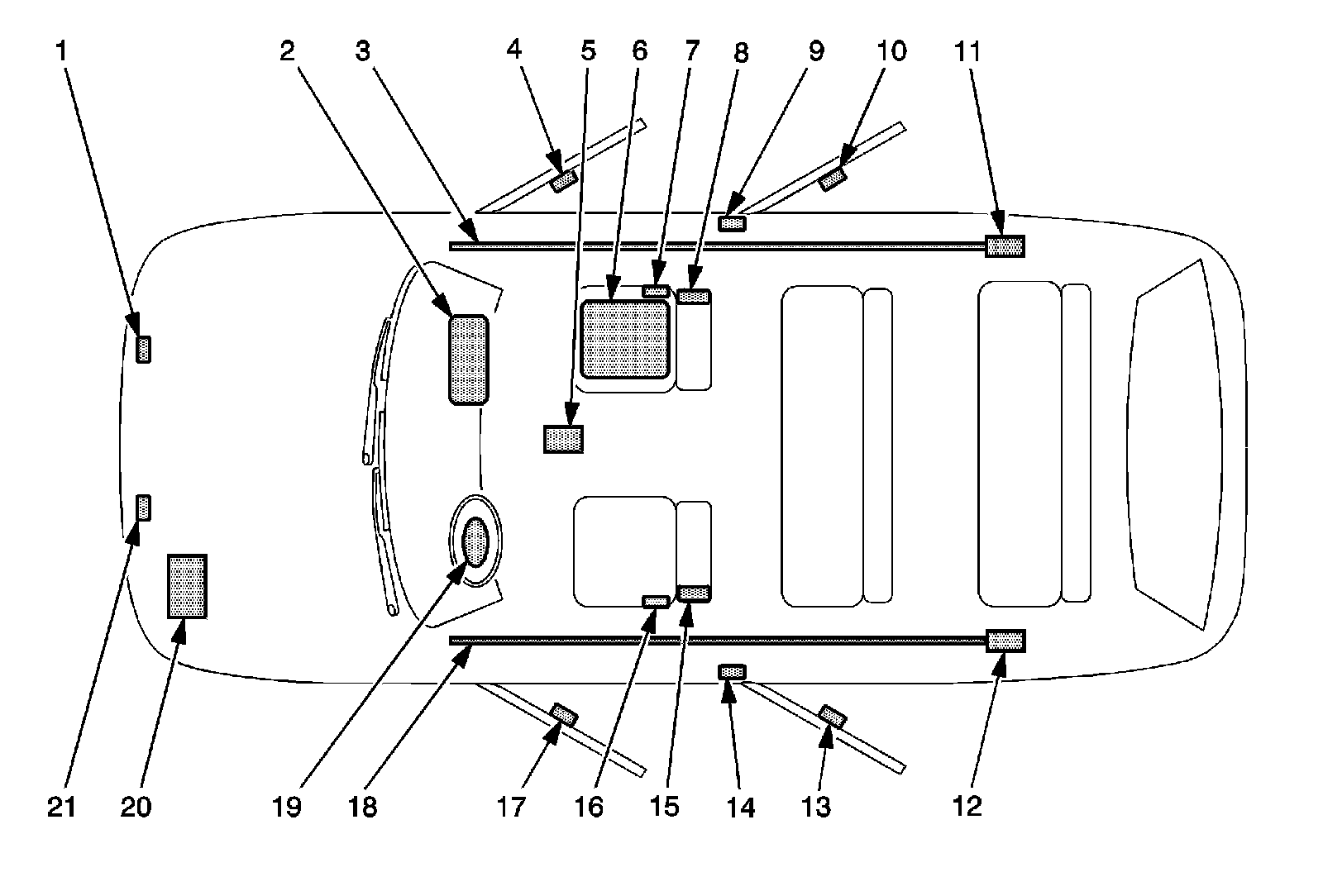 18 - Left Roof Rail Air Bag -Located under the headliner, extending from the driver front windshield pillar to the driver rear windshield pillar