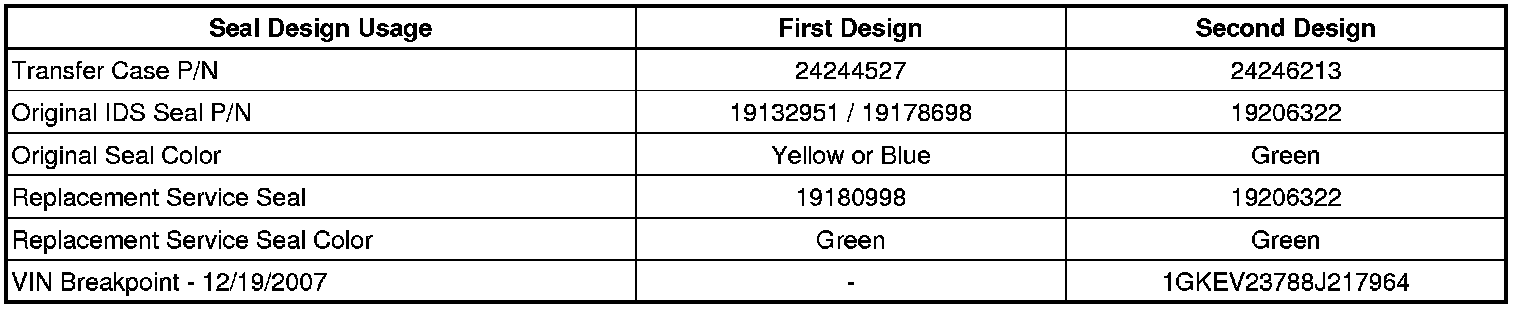Replacing the IDS seal with the correct seal requires identification between first and second design transfer cases. Refer to the table below.
