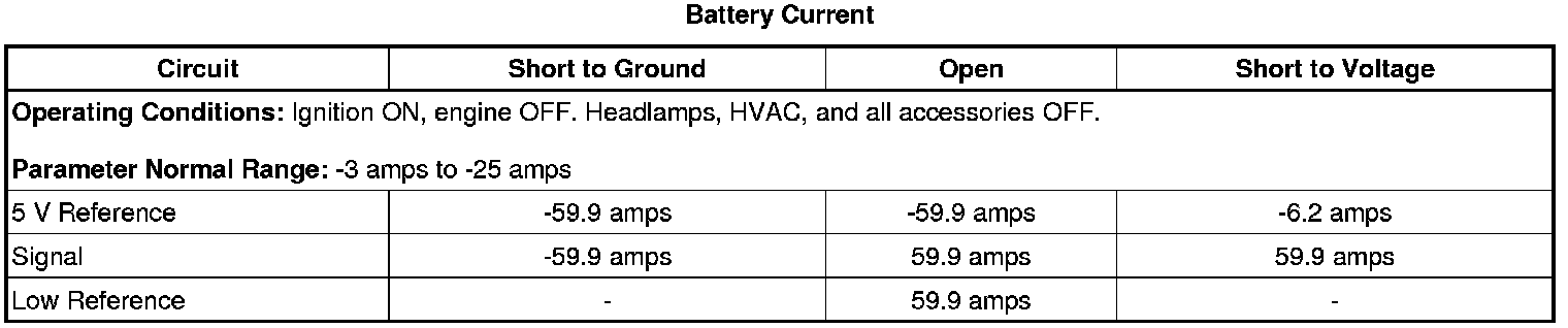 The battery current sensor is a 3-wire hall effect current sensor. The body control module (BCM) supplies 5 V and ground to the battery current sensor. The battery current sensor measures the amount of current flowing to or from the battery, and supplies a pulse width modulation (PWM) signal to the BCM. The signal has a normal range of 4-96 percent duty cycle. The BCM also monitors the current polarity, to detect if the sensor is installed backwards or on the wrong cable. The current should be negative when the engine is OFF, if the sensor is installed correctly.