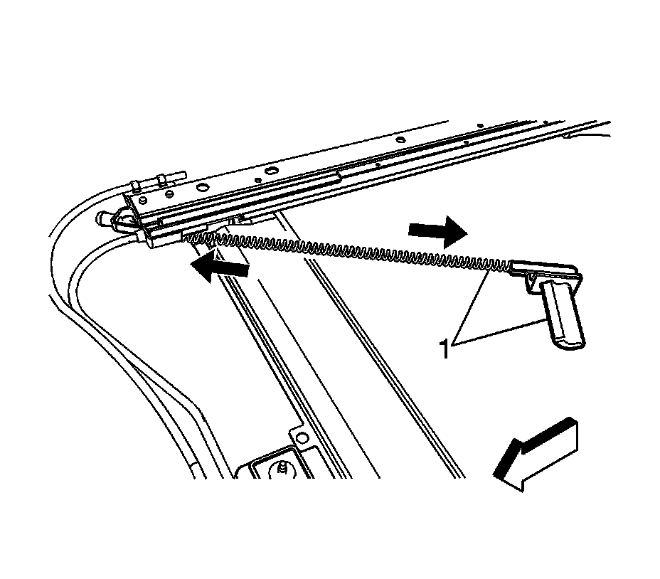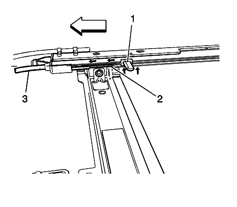 10. Lift upward on the end of the sunshade cable/guide (1), releasing it from the front stop (2).