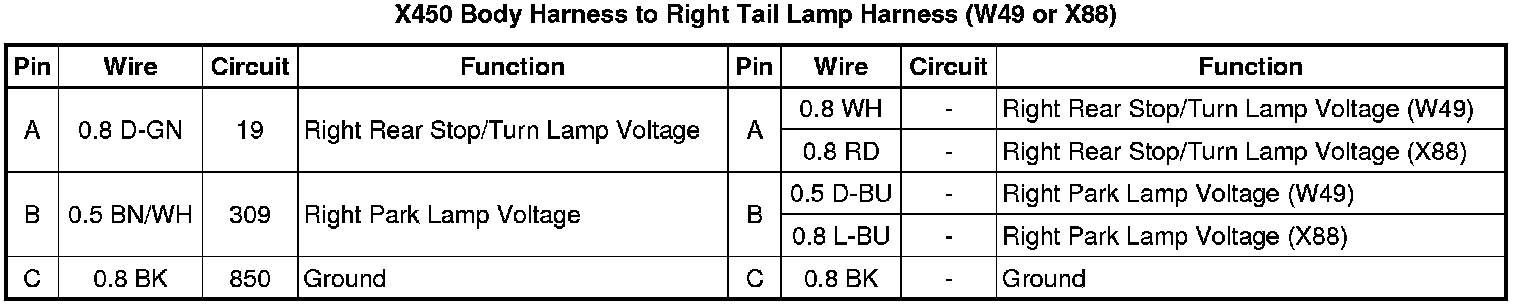 X450 Body Harness to Right Tail Lamp Harness (W49 or X88)
