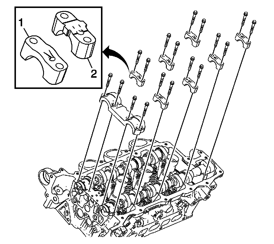 10. Install the remaining bearing caps with their orientation mark toward the center of the cylinder head.
