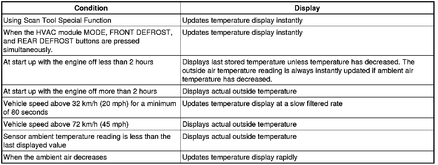 A signal and low reference circuit enables the sensor to operate. As the air temperature surrounding the sensor increases, the sensor resistance decreases. The sensor signal voltage decreases as the resistance decreases. The sensor operates within a temperature range between -40 to +101°C (-40 to +215°F). The sensor signal varies between 0-5 volts. The HVAC control module converts the signal to a range between 0-255 counts. As the air temperature increases the count value will decrease. If the HVAC control module or auxiliary HVAC control module detects a malfunctioning sensor, then the control module software will use a defaulted air temperature value. The default value for the ambient temperature sensor will be displayed on the scan tool. The default action ensures that the HVAC system can adjust the inside air temperature near the desired temperature until the condition is corrected.
