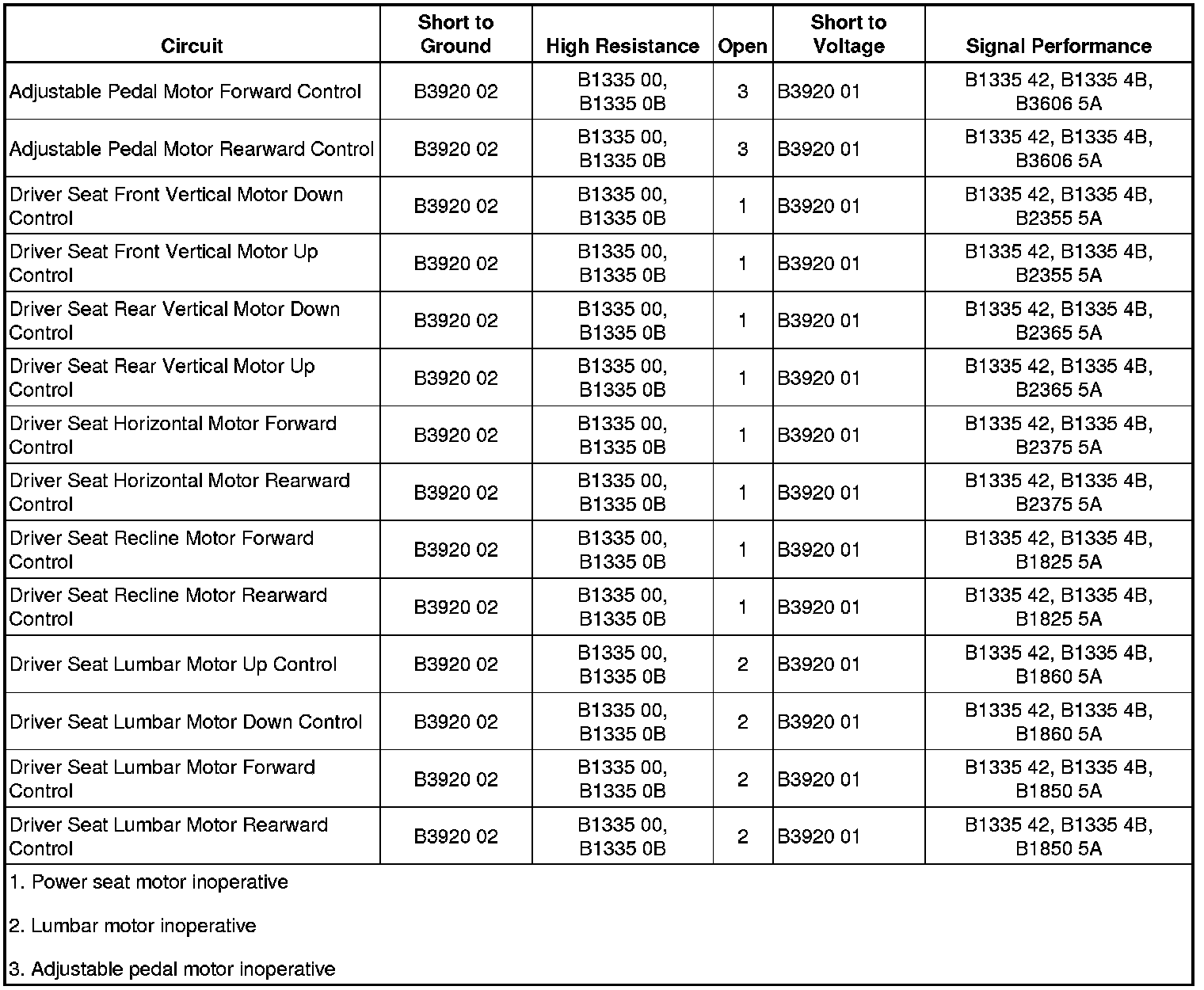 The adjustable pedal motor and all driver seat adjuster motors are disabled.