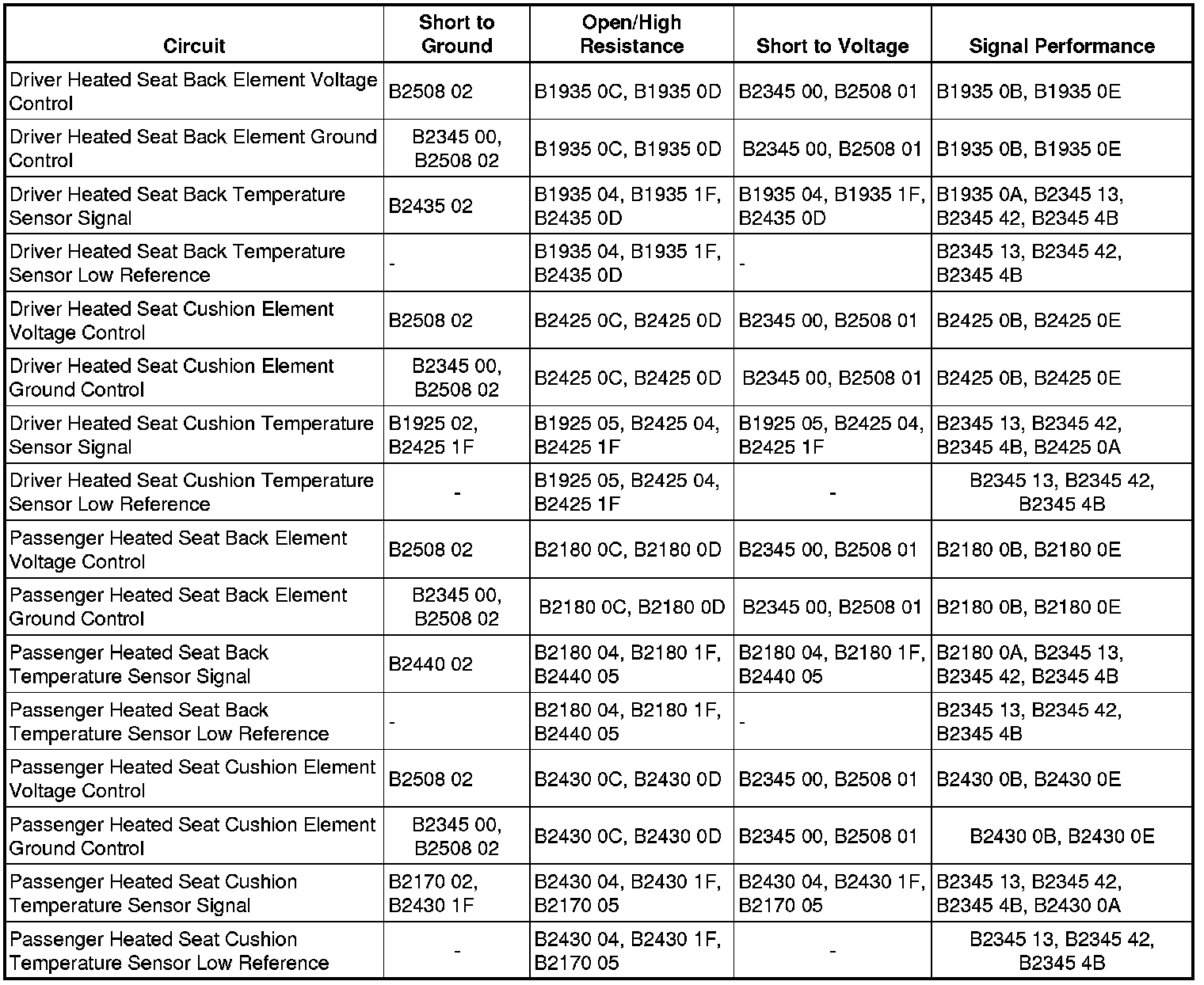 The front seat heating elements are controlled by a common high current relay internal to the heated seat module (HSM) and on the low side by individual element control circuits. The HSM connects the seat heater element supply voltage circuits to a common reference point. This reference point is biased to approximately 2.5 V. Before the HSM will allow heated seat operation, it checks to see if the heating element supply voltage circuits and control circuits are shorted to ground or battery voltage. Once the HSM verifies that it is not closing to a shorted heating element, it allows heated seat operation. After which it continues to monitor for a shorted circuit.