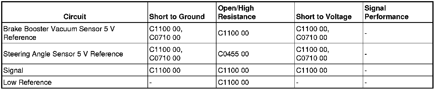 The electronic brake control module (EBCM) provides a 5 V reference circuit to the brake booster vacuum sensor and the steering angle sensor. The brake booster vacuum sensor converts the change in vacuum levels in the brake booster into a signal voltage ranging from 0.13 - 3.30 V and is monitored by EBCM.