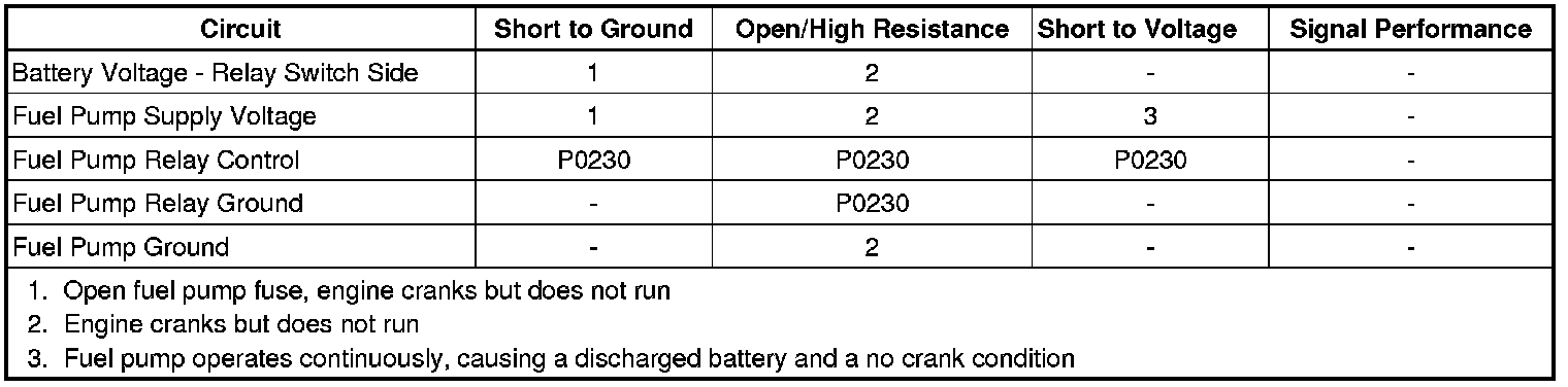 The control module monitors the voltage on the fuel pump relay control circuit. If the control module detects an incorrect voltage on the fuel pump relay control circuit, a fuel pump relay control DTC sets.