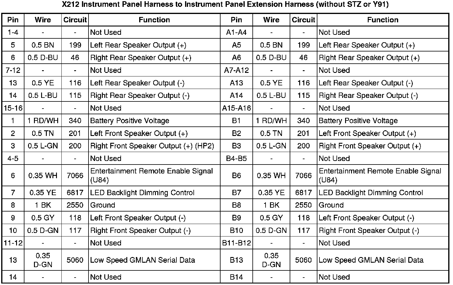 X212 Instrument Panel Harness to Instrument Panel Extension Harness (without STZ or Y91)