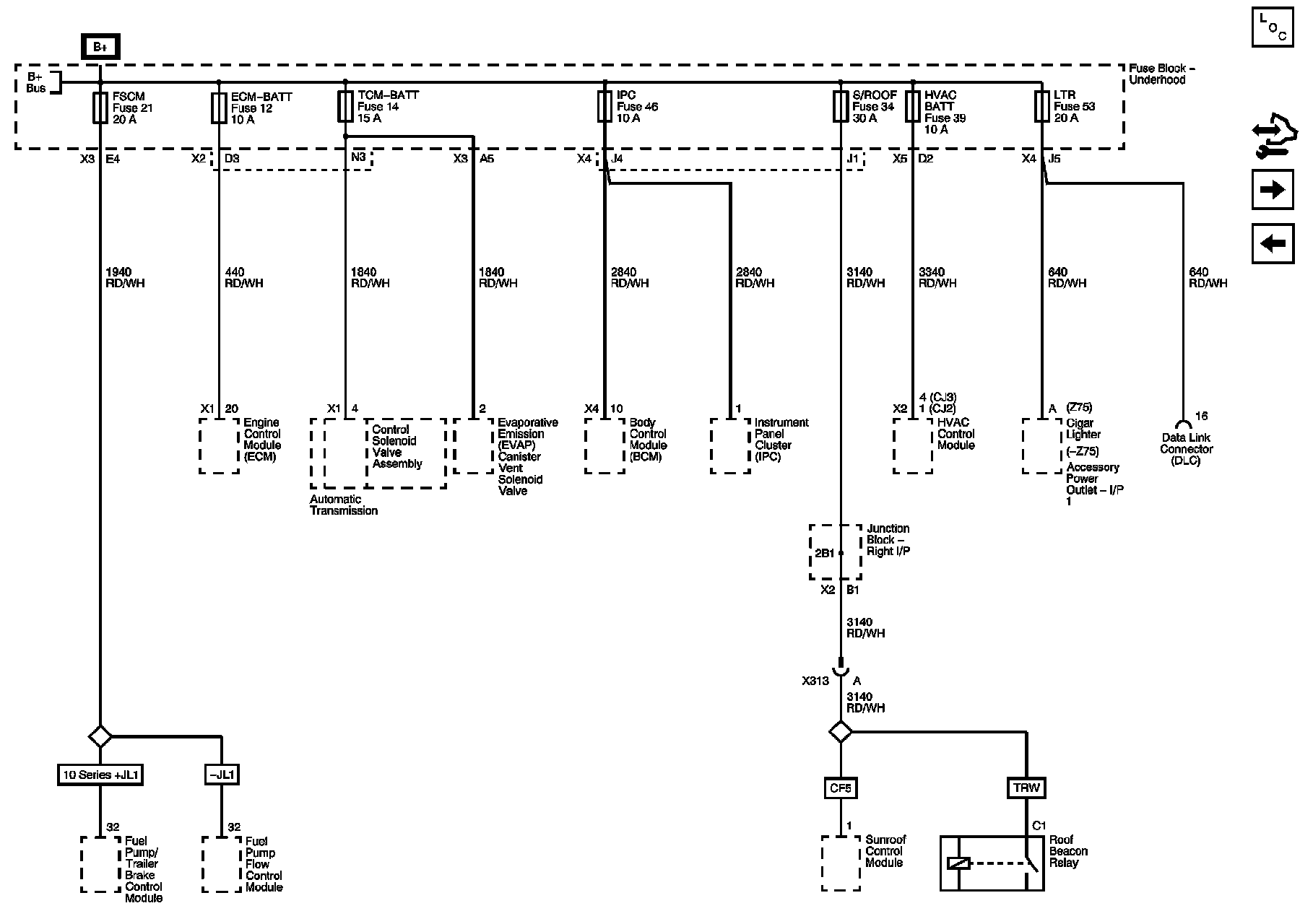 ECM-BATT, FSCM, HVAC BATT, IPC, LTR, S/ROOF, and TCM-BATT Fuses