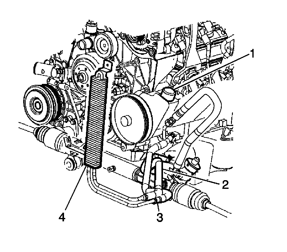 5. Disconnect the power steering gear outlet hose (2) from the power steering fluid cooler (4).