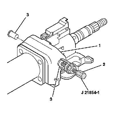 9. Remove the 2 pivot pins (3) from the steering column tilt head assembly (1) by using remover J 21854-01 (2).