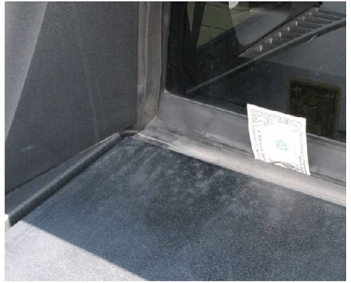 2. Position the transparent sheet or paper currency (1) so that 1/2 will extend above the tonneau or cargo cover front seal.