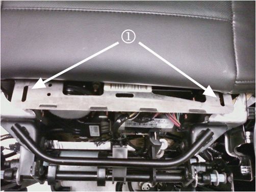 2. Locate the slot on each side of the cushion pan frame by lifting the cushion/cover up and away from the lower edge of the frame to expose the slots (1).