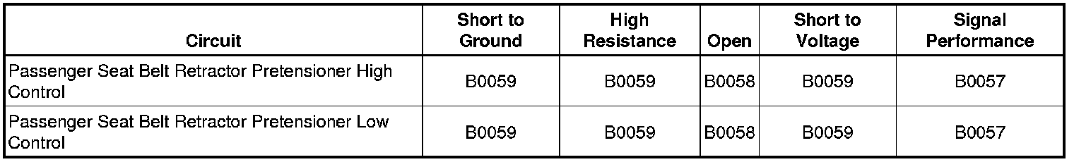 * Passenger seat belt retractor pretensioner high or low circuits are shorted to voltage or shorted to ground for 500 milliseconds.