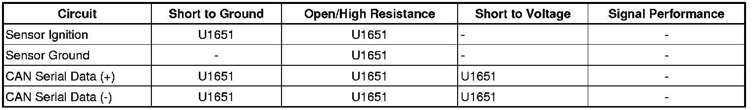The yaw and lateral accelerometer sensor communicates to the electronic brake control module (EBCM) through a dedicated CAN Bus serial data circuit. Any fault on either or both CAN Bus circuits will cause DTC U1651 to be set in the EBCM module.