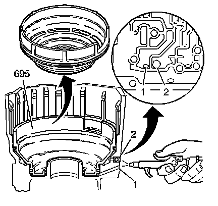 5. Blow compressed air into the case passage to remove the low and reverse clutch piston (695).