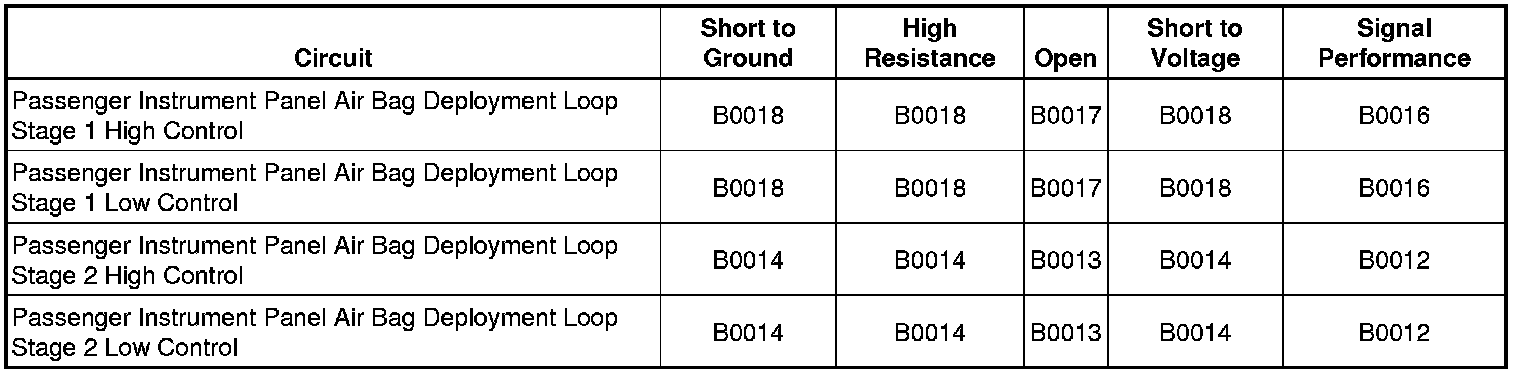* The passenger instrument panel air bag stage 1 or stage 2 high circuit is less than 2.4 volts and passenger instrument panel air bag stage 1 or stage 2 deployment loop resistance is less than 6 ohms for 500 milliseconds.