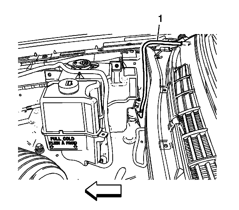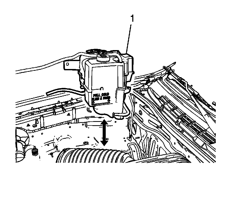 8. Remove the washer solvent container / coolant recovery reservoir (1) from the engine compartment.