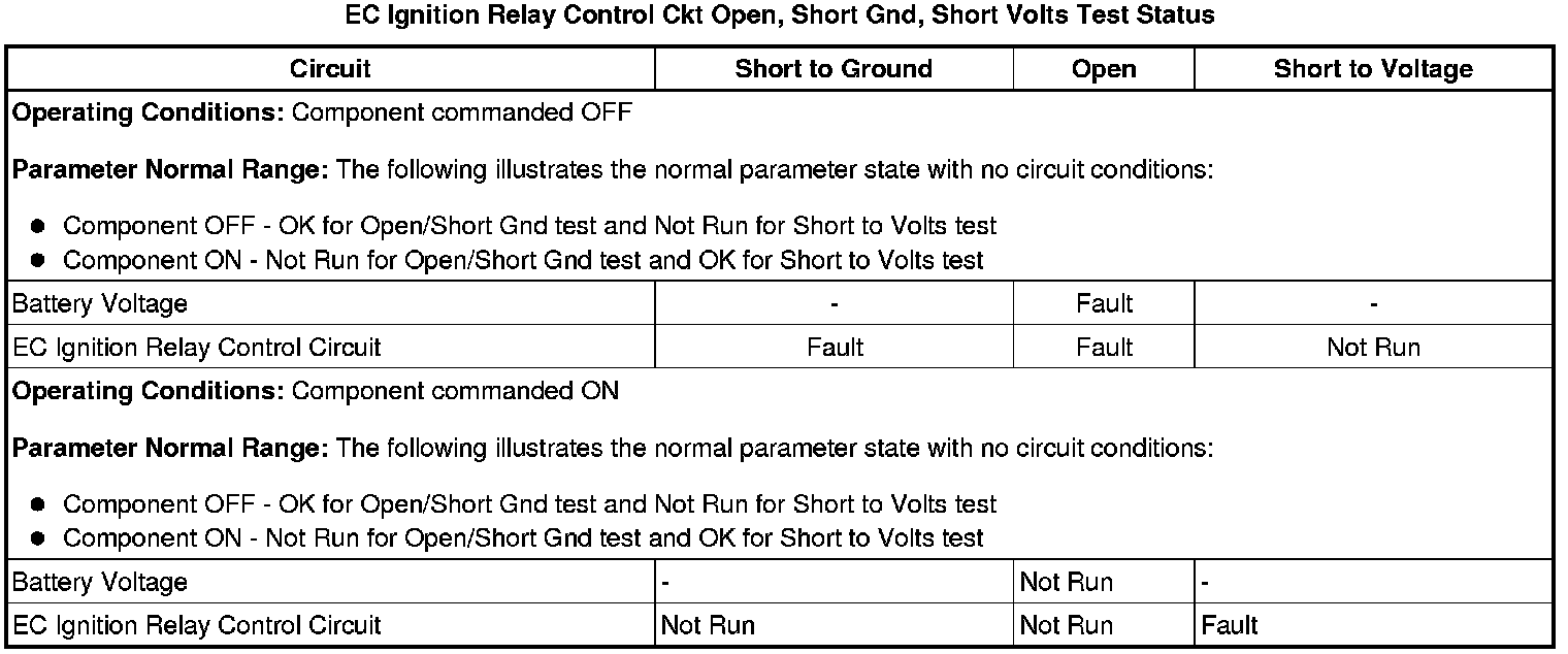 * EC Ignition Relay Control Ckt Short Volts Test Status