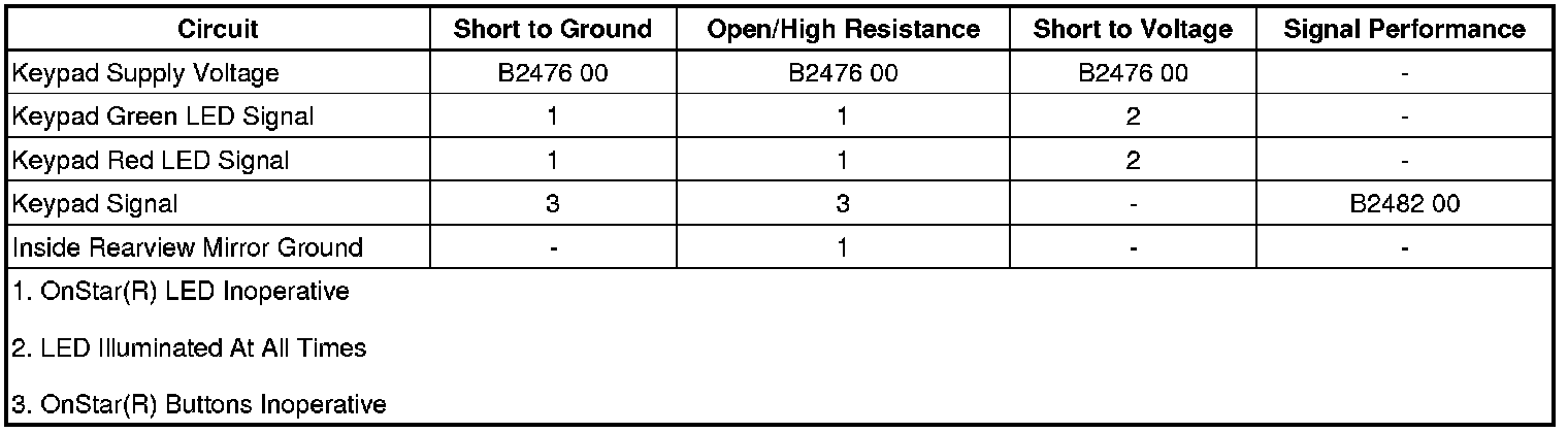 The OnStar(R) button assembly consists of 3 buttons, Call/Answer, OnStar(R) Call Center, and OnStar(R) Emergency. The communication interface module (CIM) supplies the OnStar(R) button assembly with 10 V via the keypad supply voltage circuit. Each of the buttons, when pressed, completes the circuit across a resistor allowing a specific voltage to be returned to the CIM over the keypad signal circuit. Depending upon the voltage range returned, the CIM is able to identify which button has been activated.