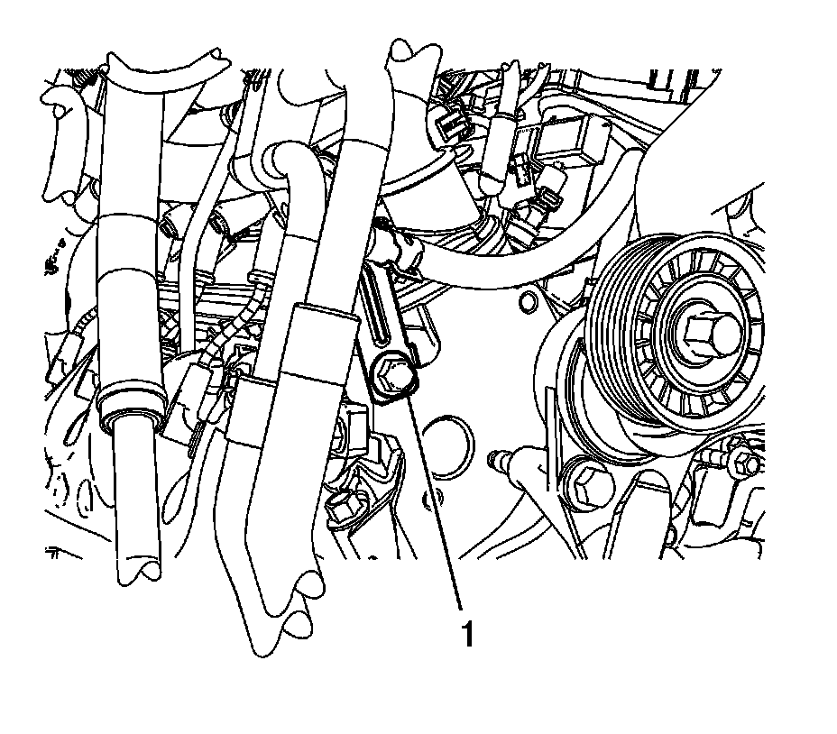 6. Remove the heater hose bracket bolt (1) from the front of the right cylinder head.