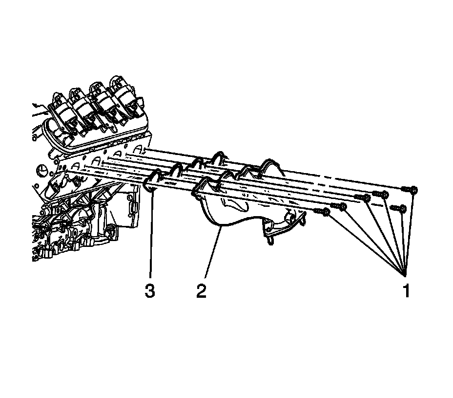 8. Remove the exhaust manifold (2) and gasket (3). Discard the gasket.