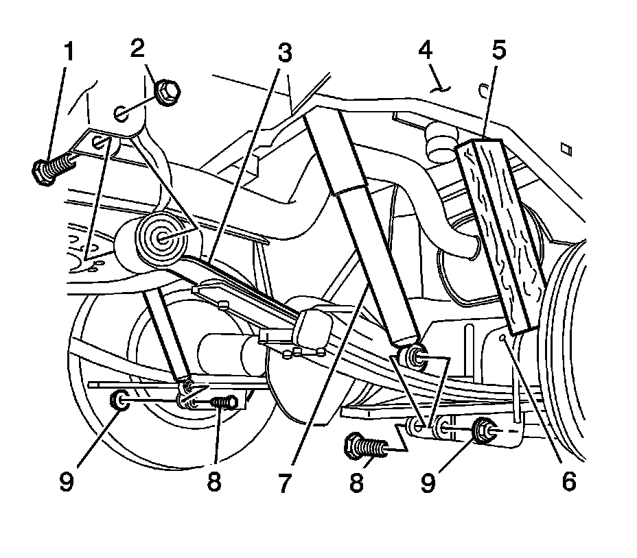 8. Install both rearward spring shackle bolts and nuts. Refer to Leaf Spring Replacement Rear Suspension
