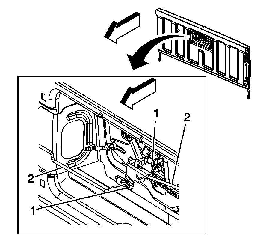 2. Disconnect the clips (1) retaining the endgate latch rods (2) to the endgate handle.