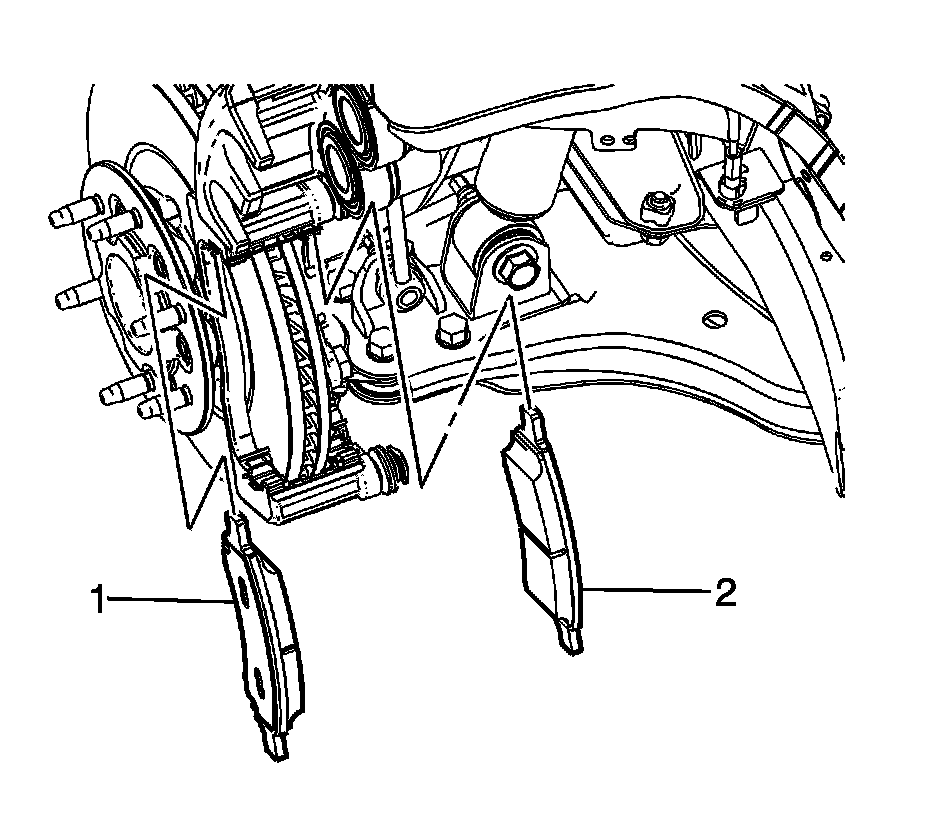 Caution: Support the brake caliper with heavy mechanic wire, or equivalent, whenever it is separated from its mount and the hydraulic flexible brake hose is still connected. Failure to support the caliper in this manner will cause the flexible brake hose to bear the weight of the caliper, which may cause damage to the brake hose and in turn may cause a brake fluid leak.