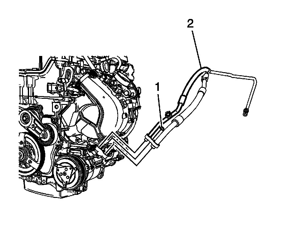13. Remove the A/C line nut (1) and line (2) from the compressor and reposition the line to the side.