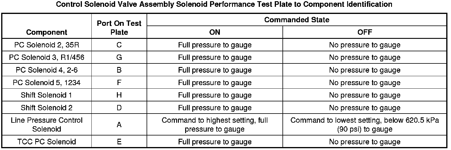 The purpose of this procedure is to test the functionality of the control solenoid valve assembly solenoids for a gross stuck open or stuck closed condition. The DT-47825-100 - test plate is bolted to the control solenoid valve assembly on the valve body mounting surface. Pressurized air is passed into the aluminum test plate, through the control solenoid valve assembly solenoid passage and back to a pressure gauge on the test plate. The pressure gauge indicates open if air pressure is passed through the solenoid, or closed if the solenoid is unable to pass air through. A scan tool is used to command the solenoids ON and OFF. While watching the pressure gauge, one can determine the valve functionality. The recommended shop air pressure for this test is 90-100 psi.