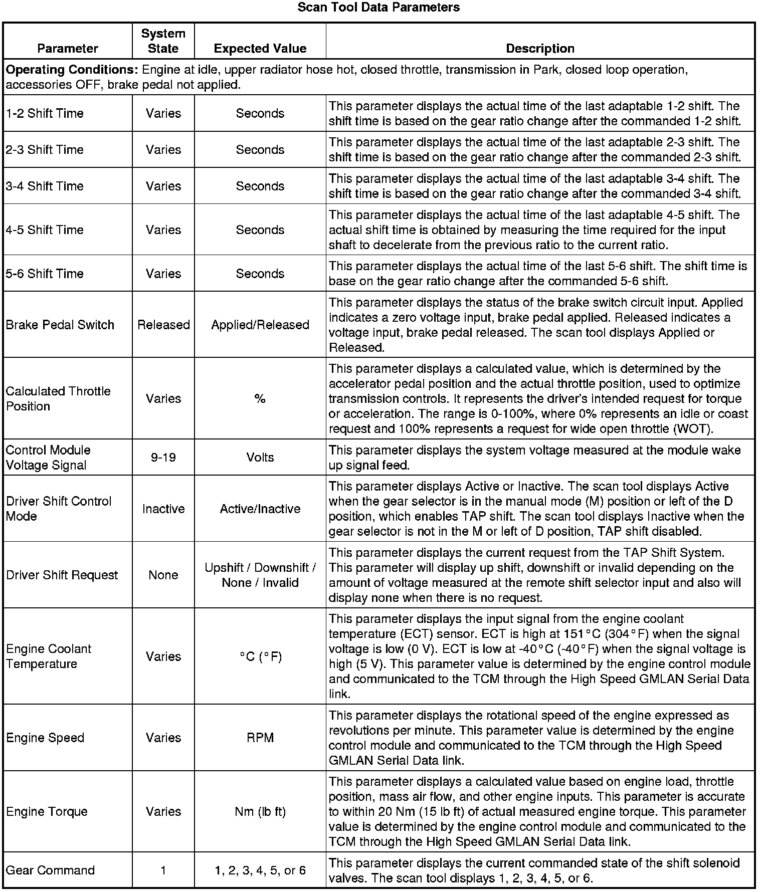 The Transmission Control Module Scan Tool Data List contains all transmission related parameters that are available on the scan tool. The list is arranged in alphabetical order. A given parameter may appear in any one of the data lists, and in some cases may appear more than once, or in more than one data list in order to group certain related parameters together.