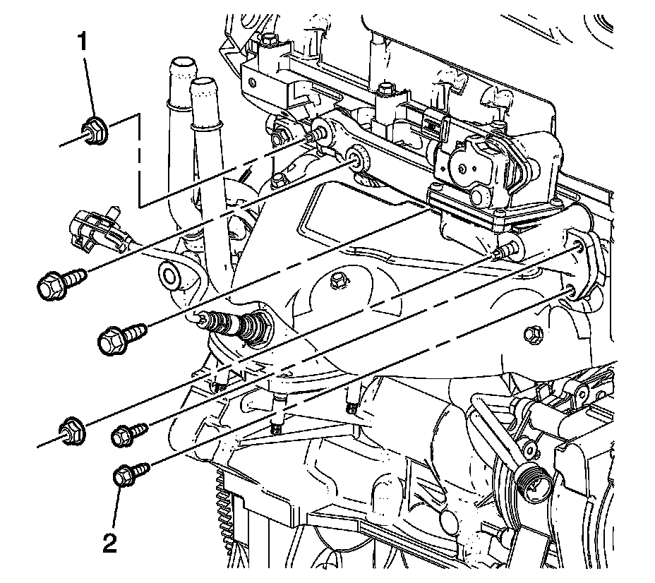 3. Install the secondary air injection pipe assembly bolts (2) and tighten to 10 Nm (89 lb in).